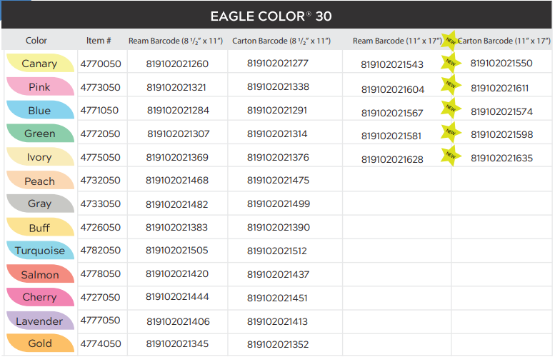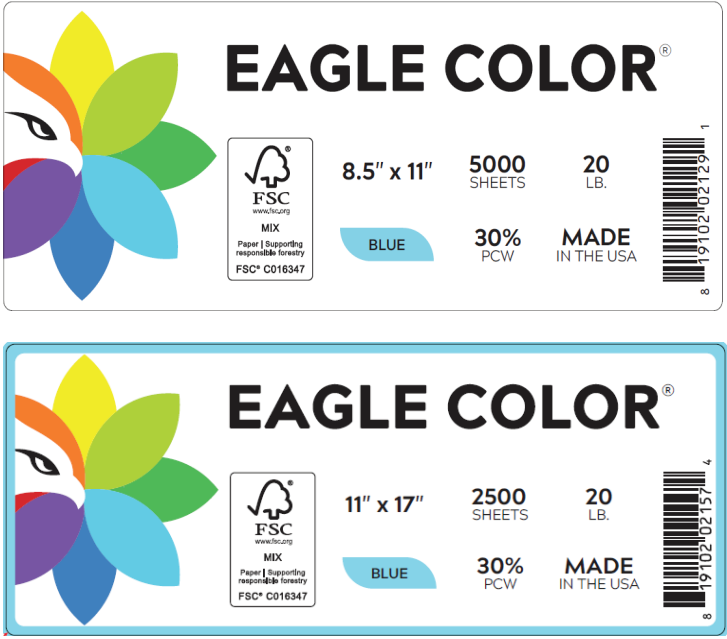 American Eagle Paper Mills® is pleased to announce that we are refreshing our color cut size line. On a rolling basis starting in late August, we will be transitioning from Premium Color 30 to our new Eagle Color® 30. This change aligns our Eagle Color® 30 with our Eagle Office® portfolio of products.