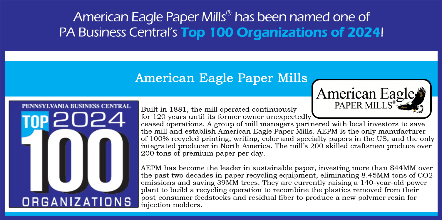 American Eagle Paper Mills is the leading US producer of recycled uncoated freesheet papers, including office, printing, and converting grades. Despite being one of the oldest mills in the US, American Eagle’s continuous innovation and infrastructure investment has improved efficiency while earning the Mill numerous environmental awards for reducing water usage by 83% and greenhouse gas emissions by 68%. Located in Tyrone, PA, the Mill was founded in 1881. It was shuttered briefly before being restarted in 2003 by a team of long-term Mill employees backed by local investors. The Mill employs over 200 proud Pennsylvania papermakers, transforming 300 tons of waste each day into premium recycled papers. To learn more about American Eagle Paper Mills and our sustainability story, please visit aepaper.com.
